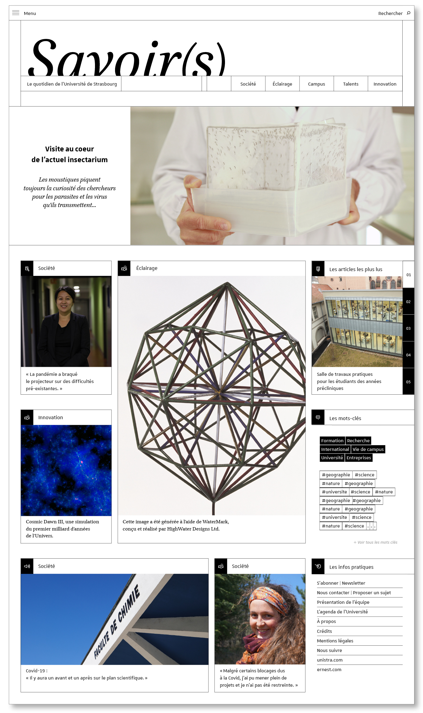 Moderne et épuré, Savoir(s) | Le quotidien de l’Université de Strasbourg place la transmission d’informations au cœur de ses préoccupations. La sobriété esthétique et l’utilisation du langage visuel de l’Université de Strasbourg – avec ses trames géométriques – facilitent la lecture d’articles et accompagnent les lecteurs. La une du site fait elle, la part belle aux images (y compris le dessin de presse) et illustre les différents aspects de la vie de l’Université de Strasbourg.